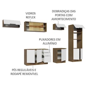 Possui puxadores em alumínio no modelo slim, gavetas com corrediças telescópicas de abertura total e portas com amortecimento para fechamento suave. Além disso, os pés são reguláveis em PVC, com rodapé removível de MDP.