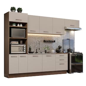 O balcão maior tem espaço para pia de inox ou pedra nas medidas de 120 x 52 cm e não acompanha tampo. O balcão de 60 cm possui tampo que pode ser recortado para instalação de cooktop.