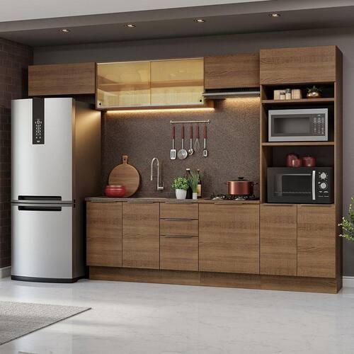 Armário De Cozinha Completa 330cm Rustic Stella Madesa 04 Rustic Esta Cozinha Completa da linha Stella da Madesa é fabricada com itens de alto padrão e design atual. Possui puxadores em alumínio no modelo slim, gavetas com corrediças telescópicas de abertura total e portas com amortecimento para fechamento suave. Além disso, os pés são reguláveis em PVC, com rodapé removível de MDP.