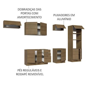 Possui puxadores em alumínio no modelo slim, gavetas com corrediças telescópicas de abertura total e portas com amortecimento para fechamento suave. Além disso, os pés são reguláveis em PVC, com rodapé removível de MDP.