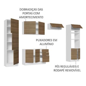 Possui puxadores em alumínio no modelo slim, gavetas com corrediças telescópicas de abertura total e portas com amortecimento para fechamento suave. Além disso, os pés são reguláveis em PVC, com rodapé removível de MDP.