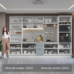 Fabricada com padrão de qualidade superior, a cozinha conta com vidro incolor sobreposto nas frentes e portas. Além disso, os puxadores são em alumínio, as gavetas abrem totalmente e as portas possuem amortecimento para fechamento suave.