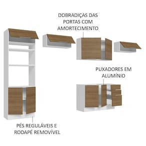 Com ampla capacidade de armazenamento, essa cozinha oferece espaço suficiente para acomodar muitos utensílios e eletros, como forno, micro-ondas, louças, panos e muito mais. Além disso, o balcão tem capacidade para pias de 120 cm x 52 cm e todos os módulos inferiores possuem pés reguláveis em PVC, além de rodapé removível em MDP de encaixe rápido.