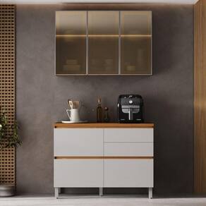 O armário de cozinha Lais conta com design elegante e moderno, ideal para quem busca funcionalidade. Projetado para oferecer amplo espaço interno, garante melhor organização e praticidade no dia a dia. Com gavetas equipadas com corrediças telescópicas, que proporcionam abertura suave e total, além de dobradiças com sistema Slow motion, assegurando fechamento silencioso e maior durabilidade. O modelo possui portas com vidro reflecta, que conferem um visual sofisticado e contemporâneo, valorizando o ambiente com efeito espelhado. Os pés reguláveis permitem perfeito nivelamento em diferentes tipos de piso. O balcão possui possibilidade de adaptação para cooktop, tornando o conjunto ainda mais versátil e adequado às necessidades da sua cozinha.