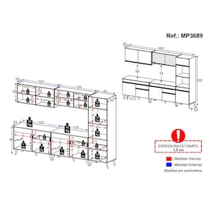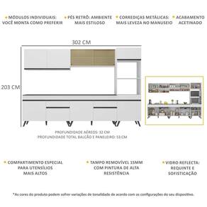 Altura: 203cm | Largura: 302cm | Profundidade: 32cm (aéreos) - 53cm (paneleiro e balcão com tampo)