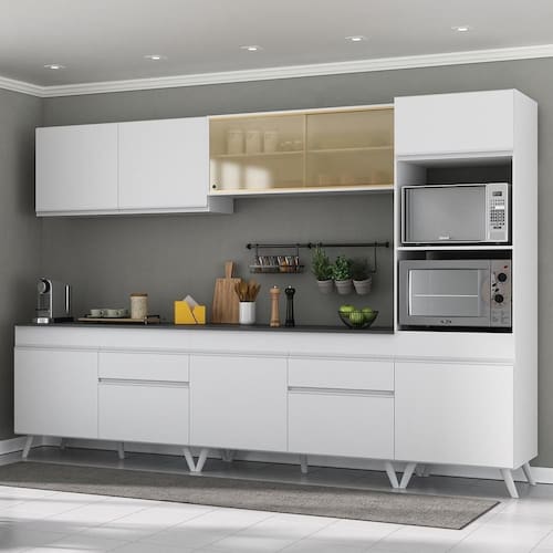 A Cozinha Completa 5 peças com Armário e Balcão MP3689 Veneza Multimóveis tem um excelente custo benefício e um amplo espaço interno. Produzida em MDP com acabamento acetinado (cerca de 20% de brilho), que garante maior durabilidade e resistência, possui corrediças metálicas (mais leveza no manuseio), pés retrô em polipropileno, que deixam o ambiente mais estiloso, puxadores em ABS e tampo em MDP 15mm com pintura de alta resistência. Os módulos são individuais e você pode montar da maneira que se adaptar melhor ao seu ambiente. O balcão possui tampo removível (compatível com pia de 120 cm). Para deixar sua cozinha mais bonita e organizada, possui módulo para forno e microndas, além de vidro reflecta e compartimento especial para utensílios mais altos.