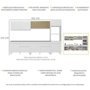 Altura: 203cm | Largura: 302cm | Profundidade: 32cm (aéreos) - 53cm (paneleiro e balcão com tampo)