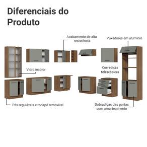 Possui puxadores com alça em alumínio e gavetas com corrediças telescópicas de abertura total. As portas contam com amortecimento para fechamento suave.