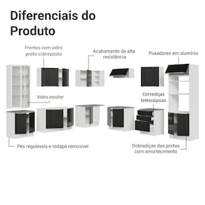 Fabricada comalto padrão de qualidade, a cozinha conta com vidro incolor sobreposto nas frentes e portas, puxadores em alumínio, gavetas com corrediças telescópicas de abertura total, portas com amortecimento para fechamento suave.
