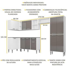 Dimensões do produto montado: Cozinha: Altura: 191 cm - Largura: 90 x 276 cm - Profundidade: 27,5 cm (aéreos e paneleiro) - 45 cm (balcão com tampo) Espaço do nicho para fogão/geladeira: Altura: 168 cm - Largura: 63 cm *Você pode consultar as medidas internas na imagem técnica do produto.