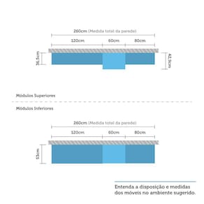 Uma cozinha modulada completa, para deixar seu ambiente super aconchegante e requintado. Composta por 8 peças cuidadosamente pensadas para sua organização. Conta com acessórios requintados como puxadores tipo gola em perfil alumínio na cor Prata, corrediças metálicas telescópicas para abertura total das gavetas e pés em Poliestireno com regulagem de altura. Os módulos são montados individualmente e permitem a instalação da forma que melhor se adeque ao seu espaço. Para este ambiente utilizamos como proposta 260cm de parede Linear.