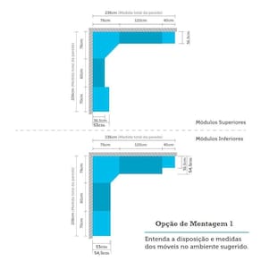Medidas Gerais do Ambiente: Opção de montagem 1: 220 x 206 e 236 x 54,5 -Altura x Largura 1 e Largura 2 x Profundidade Maior - cm- Opção de montagem 2: 220 x 146 e 296 x 54,5 -Altura x Largura 1 e Largura 2 x Profundidade Maior - cm-