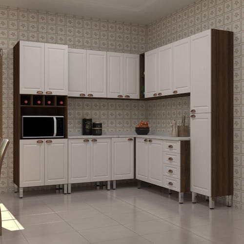 A Cozinha Safira traz design e sofisticação, a combinação perfeita entre beleza e funcionalidade. Desenvolvida em MDP, o que garante qualidade e durabilidade. Conta puxadores Bronze e pés com regulagem de altura no acabamento PS Cromado.