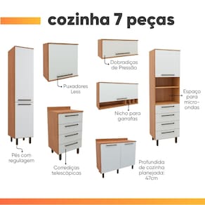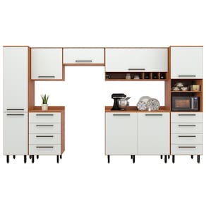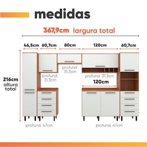 MEDIDAS ARMÁRIO: A = 216 cm (com pés) L = 367,9 cm P = 47 cm MEDIDAS PÉS: A = 14,5 cm L = 4 cm P = 4 cm PRATELEIRAS SUPORTAM ATÉ: 5 kg GAVETAS SUPORTAM ATÉ: 5 kg TAMPO SUPORTA ATÉ: 15 kg PESO SUPORTADO: 190 kg PESO: 227 kg MODELO: Armário De Cozinha Completa 8 Portas 8 Gavetas Grécia MARCA: Batrol COR: Madeirado/Off White MATERIAL: MDP ESPESSURA DO MATERIAL: 12 e 15 mm PINTURA: UV de alta qualidade ACABAMENTO: Fosco PORTAS: 8 TIPO DE PORTA: Bater / Basculantes DOBRADIÇAS: Metálicas PISTÃO A GÁS: Sim PRATELEIRAS: 19 NICHOS: 3 GAVETAS: 8 CORREDIÇAS: Telescópicas QUANTIDADE DE PUXADORES: 18 PUXADORES: Plástico PÉS: 18 (reguláveis) MATERIAL DOS PÉS: Plástico SISTEMA DE MONTAGEM: Parafusos e cavilhas DIFERENCIAIS: Design elegante e moderno / Pintura UV de alta qualidade / Amplo espaço para melhor armazenamento / Corrediças telescópicas / Pistão a gás / Pés reguláveis INSTRUÇÕES E CUIDADOS: Para maior durabilidade, recomendável que a limpeza dos móveis seja feita com pano limpo e seco. Não usar produtos químicos ou abrasivos GARANTIA: 3 meses pelo fabricante.