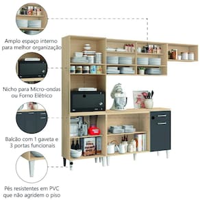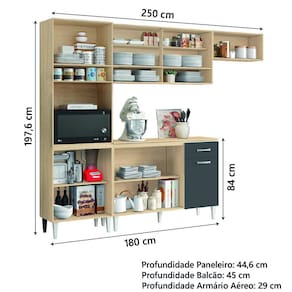 O Armário de Cozinha Completa Aurora amplo e versátil veio para garantir praticidade em seu dia a dia! Possui um design multifuncional, perfeito para sua cozinha! Conta com 9 portas, 4 nichos e 1 gaveta, com amplo espaço interno para acomodar seus utensílios. Um nicho para acomodar seu Micro-ondas ou Forno Elétrico, e o Balcão possui tampo para que você tenha uma bancada versátil e espaçosa, com capacidade para colocar eletrodomésticos e decorações. Os pés são resistentes, feitos com material que não agridem o piso e sua estrutura traz resistência e durabilidade a vida útil do produto.