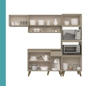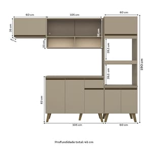 Composta por dois módulos versáteis, conta com um armário aéreo de duas portas de vidro e nicho incluso, um armário aéreo de 60cm, um balcão de 105cm com gaveteiro e uma torre quente com espaço para dois fornos. Equipada com puxadores e pés em ABS, dobradiças e corrediças metálicas e elaborada em MDP de alta qualidade, essa cozinha oferece durabilidade, resistência e sofisticação em cada detalhe!