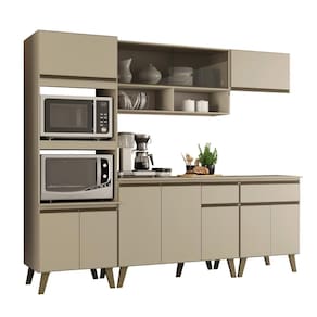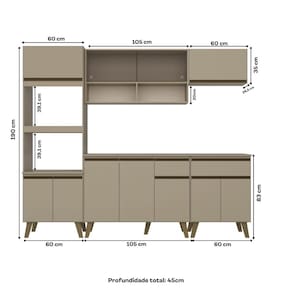 Composta por três módulos versáteis, conta com um armário aéreo de duas portas de vidro e nicho incluso, um armário aéreo de 60cm, um balcão de 105cm com gaveteiro, um balcão de 60cm com uma gaveta e 2 portas e uma torre quente com espaço para dois fornos. Equipada com puxadores e pés em ABS, dobradiças e corrediças metálicas e elaborada em MDP de alta qualidade, essa cozinha oferece durabilidade, resistência e sofisticação em cada detalhe!