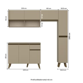 Composta por dois módulos versáteis, conta com um armário aéreo de duas portas e nicho incluso, um armário aéreo de 60cm, um balcão de 105cm com gaveteiro e um paneleiro. Equipada com puxadores e pés em ABS, dobradiças e corrediças metálicas e elaborada em MDP de alta qualidade, essa cozinha oferece durabilidade, resistência e sofisticação em cada detalhe!