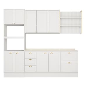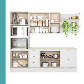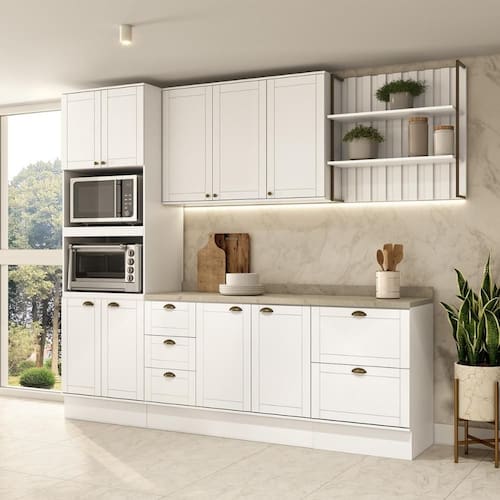 A Cozinha Milla Glimmer lembra as cozinhas tradicionais, com detalhes especiais em frisos e puxadores – porém, tudo em uma simplicidade visual. Possui 5 módulos, entre eles aéreo com 3 portas, balcão com 1200 mm, aéreo ripado com prateleiras de 800 mm, torre quente e um balcão de 600 mm. Conta também com puxadores em metal no acabamento “ouro velho” e matéria-prima em BP e MDF, criando uma harmonia fantástica com os demais itens dentro do espaço em que a cozinha está inserida.