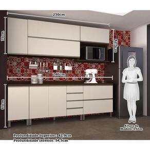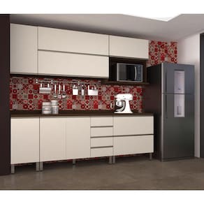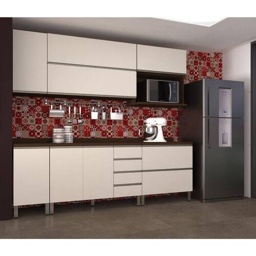 Desenvolvida com materiais de altíssima qualidade, a Cozinha Jade oferece excelente distribuição de espaço interno, dobradiças Slowmotion com amortecedor incorporado para fechamento suave das portas. Puxadores tipo Gola em perfil alumínio na cor Inox com ponteira de proteção. Pés PS cromado com regulagem de altura.