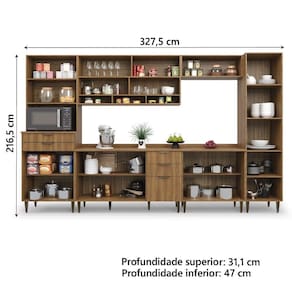 MEDIDAS DO ARMÁRIO:: A = 216,5 cm L = 327,5 cm P = 47 cm (inferior) / 31,1 cm (superior) | ALTURA DOS PÉS:: 16,5 cm | PESO:: 207,8 kg | PESO SUPORTADO:: 128 kg | PANELEIRO C/ NICHO SUPORTA ATÉ:: 25KG | PANELEIRO S/ NICHO SUPORTA ATÉ:: 25 kg | ARMÁRIO DA GELADEIRA SUPORTA ATÉ:: 8 kg | ARMÁRIO AÉREO SUPORTA ATÉ:: 15KG | BALCÃO S/ GAVETA SUPORTA ATÉ:: 25kg | PRATELEIRAS SUPORTAM ATÉ:: 5 kg | MODELO:: PAN PARIS NOG BCO | COR:: Nogal/Branco | ESPESSURA DO MATERIAL:: 15mm e 25mm | BALCÃO C/ GAVETA SUPORTA ATÉ:: 30 kg | GAVETAS SUPORTAM ATÉ:: 5kg | MARCA:: Batrol | MATERIAL DA ESTRUTURA:: MDP | ACABAMENTO:: Brilhante | PORTAS:: 13 | TIPO DE PORTA:: Bater e Basculante | DOBRADIÇAS:: Metálicas | PISTÃO:: Metálico, a gás | QUANTIDADE DE PUXADORES:: 18 | MATERIAL DOS PUXADORES:: Alumínio | PRATELEIRAS:: 13 | GAVETAS:: 5 | CORREDIÇAS:: Telescópicas | NICHOS:: 4 | PÉS:: 18 | MATERIAL DOS PÉS:: Plástico | GARANTIA:: 3 Meses | ITENS INCLUSOS:: 1 Cozinha Completa com Balcão, 1 Manual de montagem, 1 Kit Parafusos. | INSTRUÇÕES E CUIDADOS:: Para maior durabilidade, recomendável que a limpeza dos móveis seja feita com pano limpo e levemente umedecido em água e sabão neutro. Em seguida, deverá ser passado um pano limpo e seco. Cor: Nogal/Bran