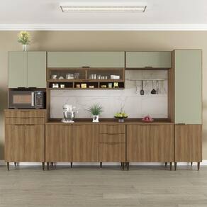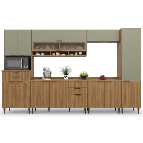 MEDIDAS DO ARMÁRIO:: A = 216,5 cm L = 327,5 cm P = 47 cm (inferior) / 31,1 cm (superior) | PESO SUPORTADO:: 128 kg | ARMÁRIO AÉREO SUPORTA ATÉ:: 15 kg | BALCÃO C/ GAVETA SUPORTA ATÉ:: 30kg | ALTURA DOS PÉS:: 16,5 cm | PANELEIRO C/ NICHO SUPORTA ATÉ:: 25 kg | PANELEIRO S/ NICHO SUPORTA ATÉ:: 25 kg | ARMÁRIO DA GELADEIRA SUPORTA ATÉ:: 8 kg | PESO:: 207,8 kg | BALCÃO S/ GAVETA SUPORTA ATÉ:: 25kg | PRATELEIRAS SUPORTAM ATÉ:: 5kg | GAVETAS SUPORTAM ATÉ:: 5kg | MODELO:: PAN PARIS VERDE | MARCA:: Batrol | COR:: Nogal/Verde | MATERIAL DA ESTRUTURA:: MDP | SPESSURA DO MATERIAL:: 15mm e 25mm | PORTAS:: 13 | ACABAMENTO:: Fosco | DOBRADIÇAS:: Metálicas | PISTÃO:: Metálico, a gás | MATERIAL DOS PUXADORES:: Alumínio | GAVETAS:: 5 | NICHOS:: 4 | PÉS:: 18 | MATERIAL DOS PÉS:: Plástico | GARANTIA:: 3 Meses | ITENS INCLUSOS:: 1 Cozinha Completa com Balcão, 1 Manual de montagem, 1 Kit Parafusos. | TIPO DE PORTA:: Bater e Basculante | QUANTIDADE DE PUXADORES:: 18 | PRATELEIRAS:: 13 | INSTRUÇÕES E CUIDADOS:: Para maior durabilidade, recomendável que a limpeza dos móveis seja feita com pano limpo e levemente umedecido em água e sabão neutro. Em seguida, deverá ser passado um pano limpo e seco | CORREDIÇAS:: Telescópicas Cor: Nogal Verde Mar