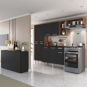 Dimensões do produto montado: Cozinha - Altura: 184cm - Largura: 228cm - Profundidade: 27cm (aéreos e paneleiro) - 44,5cm (balcão com tampo) Espaço do nicho para fogão/geladeira - Altura: 162cm - Largura: 61cm Aparador - Altura: 70cm | Largura: 123cm | Profundidade: 32cm *Você pode consultar as medidas internas na imagem técnica do produto.