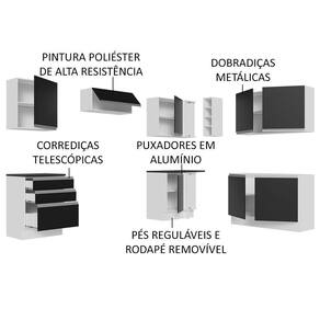 O acabamento da estrutura é branco fosco e as portas e frentes são preto. É feito em Pintura Poliéster ecológica de alta resistência, que oferece proteção contra os efeitos da água e do calor.