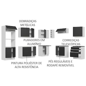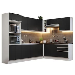 A Cozinha de Canto da linha Acordes da Madesa é fabricada em 100% MDF e possui itens de qualidade como puxadores em alumínio, dobradiças metálicas e corrediças telescópicas.