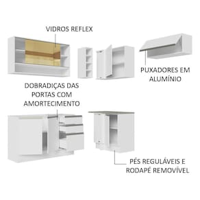 Para completar, o acabamento da cozinha é em Branco, feito em Pintura Poliéster com 7 camadas que protegem o móvel dos efeitos do álcool da água e do calor.