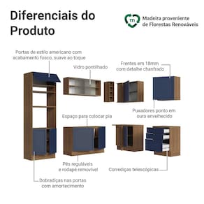O acabamento de alta resistência da estrutura é em tom amadeirado Rustic, das frentes em Azul e possui uma textura suave ao toque. O destaque fica por conta dos puxadores ponto em ouro envelhecido, feitos com metal resistente, trazem personalidade e um charme único. Outro diferencial está no detalhe chanfrado das frentes, que forma molduras elegantes e dá profundidade ao design.