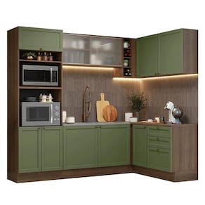 O acabamento de alta resistência da estrutura é em tom amadeirado Rustic, das frentes em Verde e possui uma textura suave ao toque. O destaque fica por conta dos puxadores ponto em ouro envelhecido, feitos com metal resistente, trazem personalidade e um charme único. Outro diferencial está no detalhe chanfrado das frentes, que forma molduras elegantes e dá profundidade ao design.