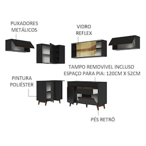 Para oferecer uma maior durabilidade, o móvel é fabricado com materiais e processos de alta qualidade. Possui acabamento preto em Pintura Poliéster ecológica, corrediças e dobradiças metálicas, puxadores em alumínio, pés em madeira maciça e um lindo vidro no modelo reflex no aéreo.
