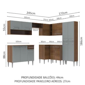 - 44 cm de profundidade nos balcões e 27 cm de profundidade nos aéreos e nos paneleiros