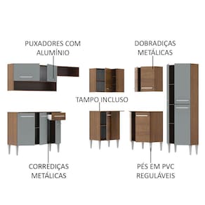 Fabricada com itens de qualidade, possui puxadores com alumínio, corrediças e dobradiças metálicas e pés reguláveis em PVC. Acompanha ainda tampo em todos os balcões e também é possível instalar pia de inox ou pedra, na medida de 105 x 44 cm.