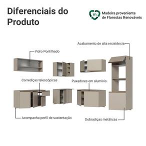 A linha Nice se diferencia por ser suspensa, acompanhando ferragens para fixação. O acabamento de alta resistência no tom crema e os puxadores em bronze metalizado reforçam o visual elegante, enquanto as corrediças proporcionam abertura total das gavetas. Os balcões acompanham tampo, garantindo praticidade.