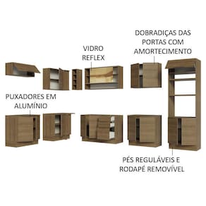 O conjunto é formado por módulos avulsos, que podem ser organizados de acordo com o espaço disponível. Isso permite que o móvel se adapte a diferentes projetos, o que a torna uma cozinha planejada.
