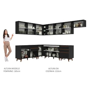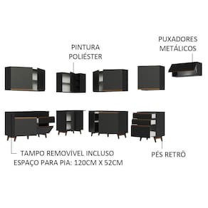 Fabricada com materiais e processos de alta qualidade, possui acabamento preto em Pintura Poliéster ecológica, corrediças e dobradiças metálicas, puxadores em alumínio e pés retrô em madeira maciça. Esses detalhes conferem beleza e aumentam a durabilidade do móvel.