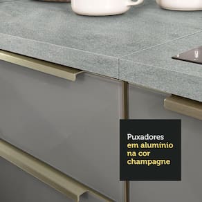 O acabamento da estrutura é branco e o das portas e frentes é cinza. É feito em Pintura Poliéster, com sete camadas que protegem o móvel dos efeitos do álcool da água e do calor.