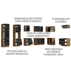 O acabamento da estrutura é em amadeirado Rustic e o das portas e frentes é preto. É feito em Pintura Poliéster, com sete camadas que protegem o móvel dos efeitos do álcool da água e do calor.