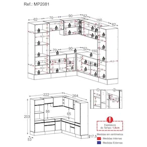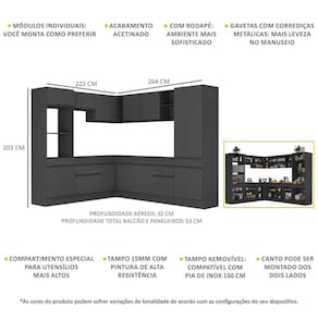 Altura: 203cm | Largura: 222 x 264cm | Profundidade: 32cm (aéreos) - 53cm (balcão com tampo e paneleiro)