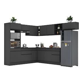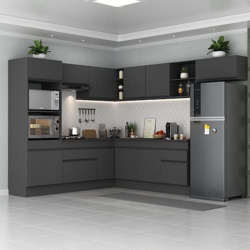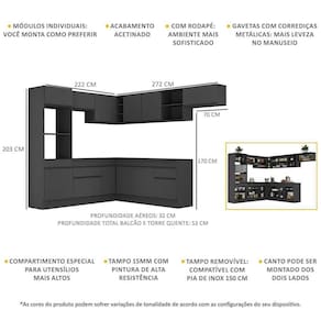 Dimensões do produto montado: Altura: 203cm | Largura: 222 x 272cm | Profundidade: 32cm (aéreos) - 53cm (balcão com tampo e paneleiro) *Você pode consultar as medidas internas na imagem técnica do produto. *As cores do produto podem sofrer variações de tonalidade de acordo com as configurações do seu dispositivo.