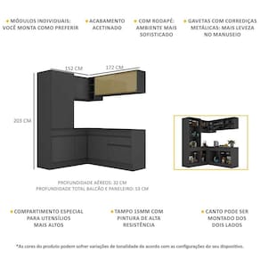 Altura: 203cm | Largura: 152 x 172cm | Profundidade: 32cm (aéreos) - 53cm (balcão com tampo e paneleiro)