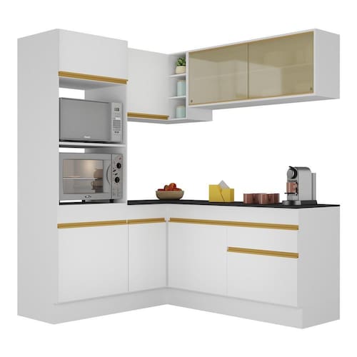 Conteúdo da Embalagem: 1 (um) armário para forno e microondas 62cm 1 (um) armário aéreo de canto 90cm 1 (um) armário aéreo com portas de vidro 120cm 1 (um) balcão com tampo de canto 90cm 1 (um) balcão com tampo 120cm 1 (um) kit com rodapés