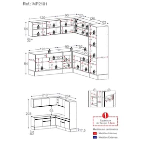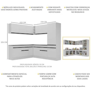 Dimensões do produto montado: Altura: 203cm | Largura: 210 x 234cm | Profundidade: 32cm (aéreos) - 53cm (balcão com tampo e paneleiro) *Você pode consultar as medidas internas na imagem técnica do produto. *As cores do produto podem sofrer variações de tonalidade de acordo com as configurações do seu dispositivo.