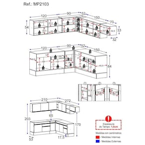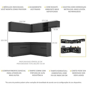 Altura: 203cm | Largura: 210 x 272cm | Profundidade: 32cm (aéreos) - 53cm (balcão com tampo)