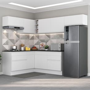 Conteúdo da Embalagem: 2 (dois) armários aéreos 70cm 1 (um) armário aéreo de canto 90cm 1 (um) armário aéreo 120cm 1 (um) balcão com tampo 70cm 1 (um) balcão com tampo de canto 90cm 1 (um) balcão com tampo 120cm 1 (um) kit com rodapés