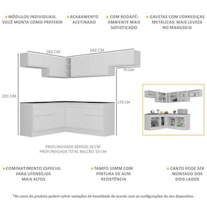 Dimensões do produto montado: Altura: 203cm | Largura: 160 x 242cm | Profundidade: 32cm (aéreos) - 53cm (balcão com tampo) *Você pode consultar as medidas internas na imagem técnica do produto. *As cores do produto podem sofrer variações de tonalidade de acordo com as configurações do seu dispositivo.