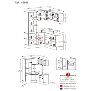 Dimensões do produto montado: Altura: 203cm | Largura: 152 x 172cm | Profundidade: 32cm (aéreos) - 53cm (balcão com tampo e paneleiro) *Você pode consultar as medidas internas na imagem técnica do produto.
