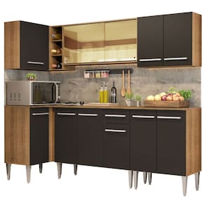 A Cozinha Emilly Play de Canto Reto da Madesa possui três balcões, três armários aéreos e uma adega acoplada, perfeitos para organizar os utensílios, louças e eletros. Além disso, todos os módulos são separados, possibilitando a montagem conforme a necessidade do seu ambiente.